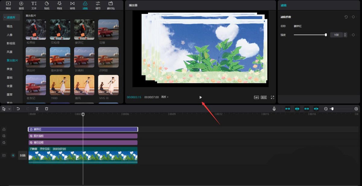 第五步:点击滤镜按钮,选择复古胶片中的姜饼红滤镜,将其添加到滤镜轨道中,见下图。
