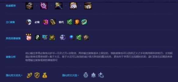 开局有铲子拿铲子,如果没有的话也可以选择拳套或者是无用大棒,优先合成珠光护手或者无尽之刃;根据装备进行选择,如果野怪掉落的装备拳套多就可以考虑连胜路线,如果是没有任何李青可以使用的装备就要走连败路线;2阶段利用三神龙尊者和玉龙过渡,3阶段优先开六神龙尊者即可
