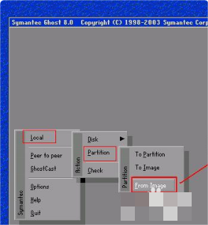 4.在出现的灰色GHOST界面中以方向键控制,顺序是Local—>Partition—>From Image。