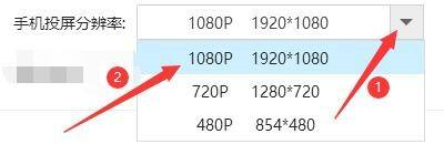 第五步:在“投屏”窗口中,点击“手机投屏分辨率”按钮,并在弹出栏目中,选择需要设置的分辨率(如图所示)。