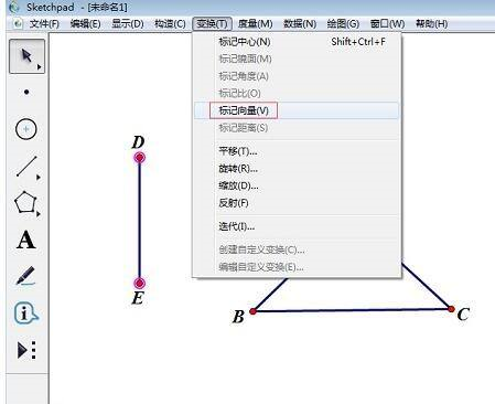 第二步:选择“移动箭头工具”,选中点E、点D,选择菜单“变换”—“标记向量”命令。将线段ED标记为平移的向量。