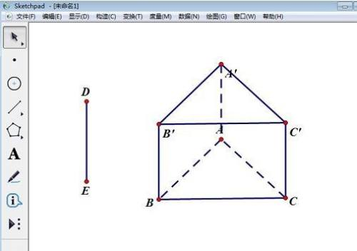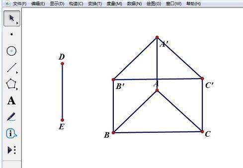 第一步:新建一个几何画板文件。绘制出一个三角形ABC,并在三角形外任意绘制一条垂直的线段DE。