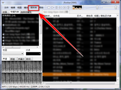 第一步:打开foobar2000播放器,点击菜单栏上的“媒体库”。