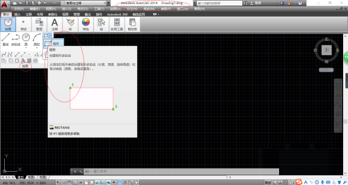 第一步:启动AutoCAD 2014辅助设计软件,如图所示。点击"默认→绘图→矩形"图标向下箭头,弹出下拉列表选择"矩形"项。