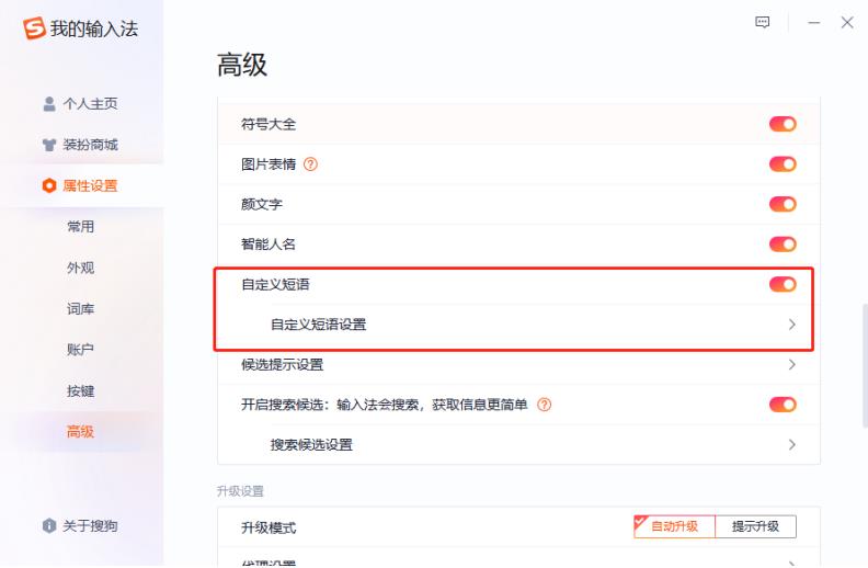 第四步:进入“高级”设置页面以后,鼠标向下滚动找到“自定义短语”选项,并打开它后面的启动开关,接着再点击下面的“自定义短语设置”选项进入。