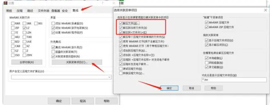在设置中选择集成 – 关联菜单项目 – 勾选上解压文件、解压到当前文件夹、解压到<文件夹>这样设置之后再右键点击压缩包就出现解压选项了。