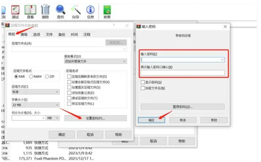 点击常规 – 设置密码 – 设置想要的压缩包密码 – 确定,这样就完成设置,之后压缩出来的压缩包文件就会自动带有密码了。