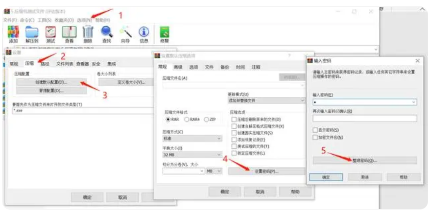 选项 – 设置 – 压缩 – 创建默认配置 – 设置密码 – 整理密码