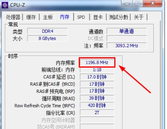 在主界面上方点击“内存”面板选项即可显示显卡的类型,通道数、内存大小等各种信息,在下方时序的红框标注中就可以看到内存频率,可能会偶尔上下波动,这就是内存频率了,如下图所示: