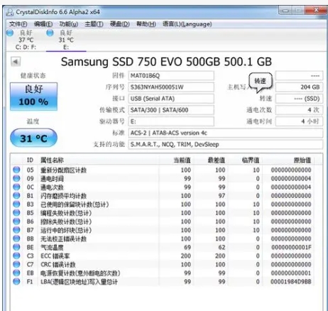 首先打开软件可以看到硬盘的很多参数,比如温度、固件、序列号、通电次数以及通电时间等等: