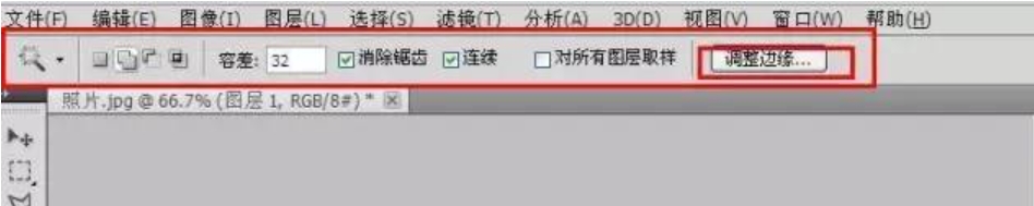 2、很明显,“虚线选区”没有把红色底色全部选中,这时我们需要在上方工具栏那里点击「调整边缘」进行调整。