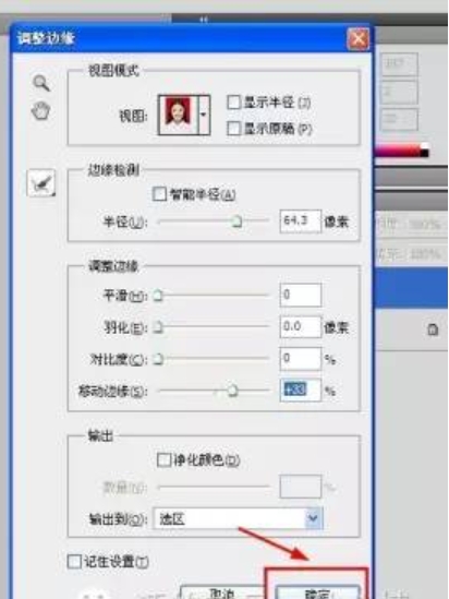 3、在「调整边缘」选项卡中对各参数进行调整,直到“虚线选区”最大限度的包围了红色区域。