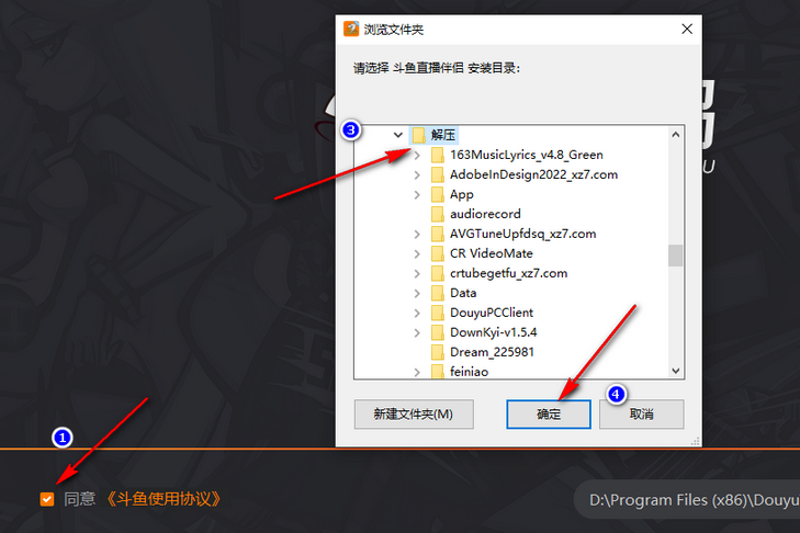 2、第二步,下载完成之后,在安装页面中,我们先将同一协议的选项进行勾选,接着有需要的话点击更换目录选项,重新选择一个路径来安装直播伴侣