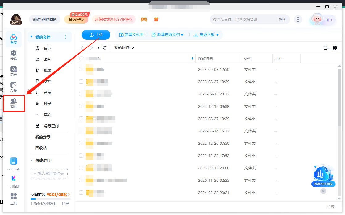 1.下载安装好“百度网盘”之后,登陆完成就会进到首页,这时候我们就看向左边的功能列表,有着“消息”的功能。