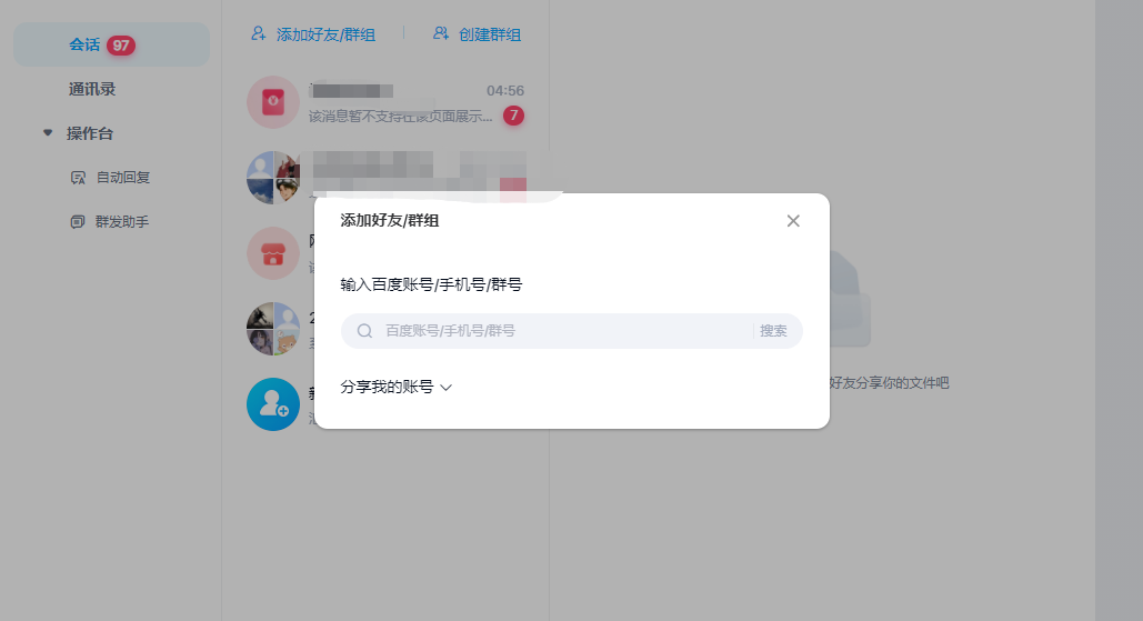 3.点击“添加好友”之后就会跳出一个搜索框,框中可以填进需要添加的好友的手机号码或者百度账号。如果需要添加群的话,也可以搜索群账号。