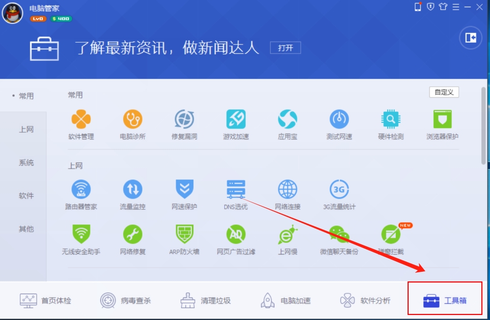 1、打开腾讯电脑管家,在右下角并找到工具箱选项。