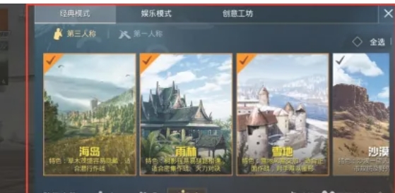 在好友加入队伍后,你可以点击屏幕左上角的“切换模式”按钮来选择你们想要玩的游戏模式和地图。这个界面会展示不同的游戏模式(如经典模式、娱乐模式等)、地图(如海岛、沙漠、雨林等)以及队伍人数(如单人、双人、四人等)。选择完毕后,点击“确定”按钮确认你的选择。