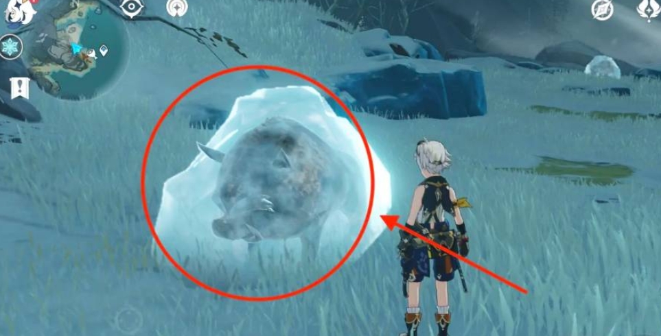 最后,使用火元素攻击融化冰块并击杀野猪,点击拾取即可获得食物“冷鲜肉”。
