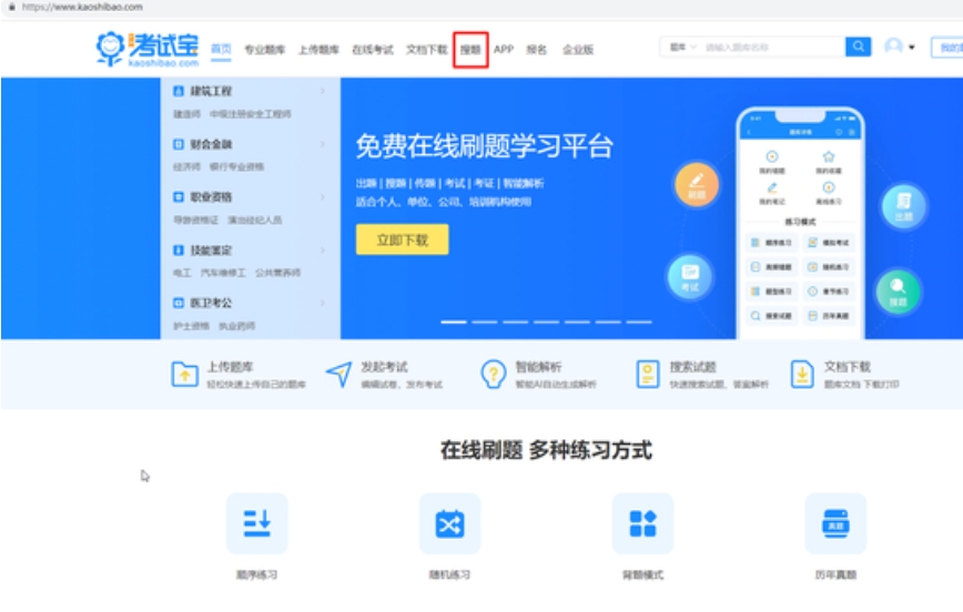 1、打开考试宝应用,在页面顶部点击【搜题】。