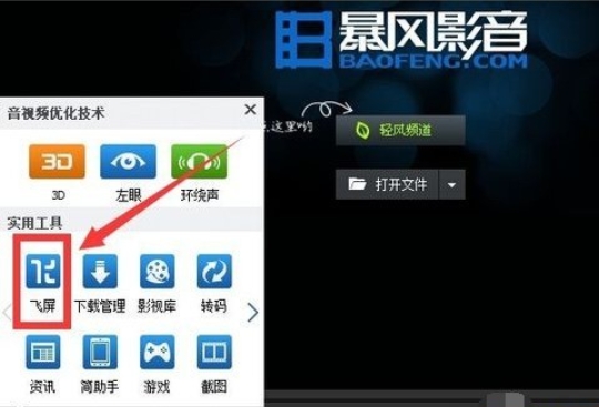 1、打开暴风影音,确保设备处于同一网络环境,点击左下角的“工具箱”,在工具箱中,选择“飞屏”功能并进入。