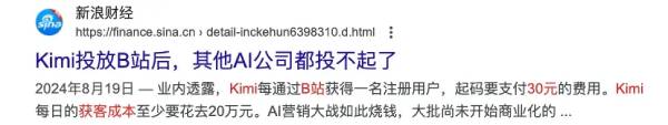 有内幕人士透露,Kimi信息流广告在B站的获客成本一度接近30元/人。