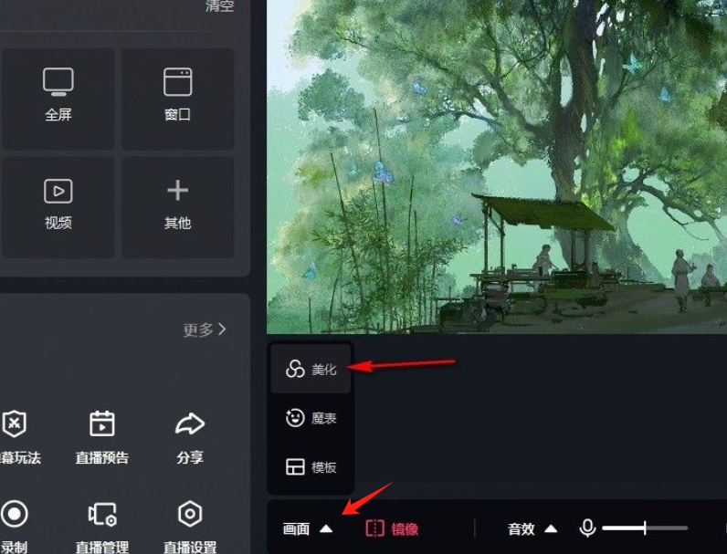 2、选择画面选项:在直播画面的下方,找到并点击“画面”选项,在选项列表中点击打开“美化”选项。