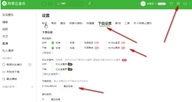 点击打开网易云音乐客户端,进入其主界面。在界面右上方找到并点击齿轮设置图标,进入设置界面。