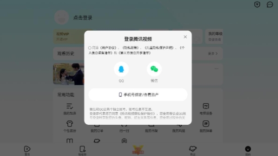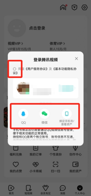 点击【点击登录】,勾选《用户服务协议》选择微信或QQ渠道登录即可。