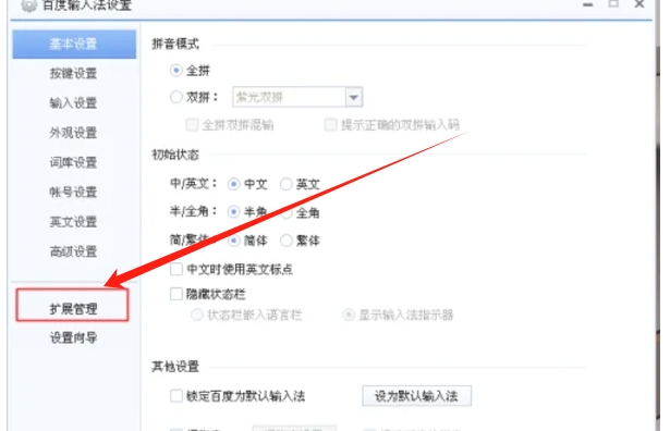 在设置界面中,找到并点击左侧的“扩展管理”选项。这里列出了所有可用的输入法扩展功能。
