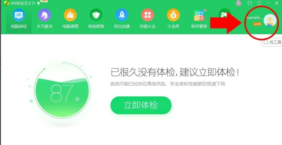 1、打开360安全卫士:在360安全卫士的首页页面右上角,找到并点击自己的头像图标。