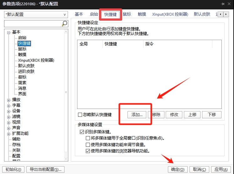 3、在快捷键设置界面中,点击“添加”按钮,此时就可以开始自定义快捷键了,添加完毕点击“确定”保存即可。