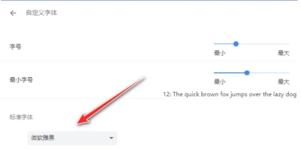 在自定义字体界面中,你可以看到当前浏览器使用的默认字体、无衬线字体、等宽字体等选项。点击每个字体旁边的下拉箭头,从列表中选择你喜欢的字体类型。此外,你还可以选择字体的大小,如“默认”、“小”、“中”、“大”、“特大”等,以适应你的阅读需求。