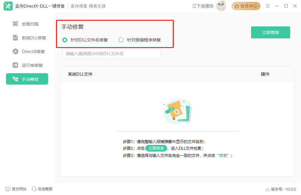 选择手动修复,可手动「输入错误提示中的DLL文件名」或「选择报错软件对应的EXE程序文件」进行修复;省略了扫描的时间,精准修复异常问题