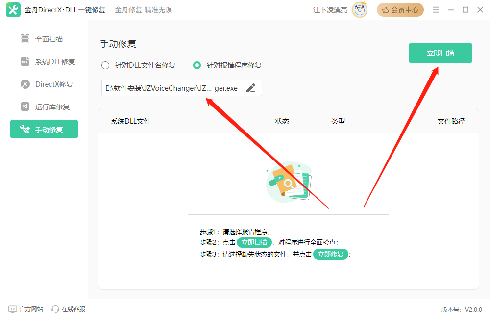 Step3、如果是软件运行错误,那么选择对应的EXE位置后,点击「立即扫描」即可;