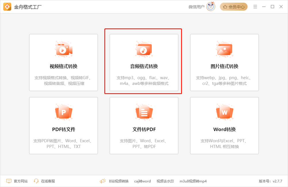功能特点:金舟格式工厂是一款集齐多种格式转换功能的格式转换工具,分别支持视频、音频、文档、图片等多种格式转换,而且还提供了批量处理功能,帮助我们多文件批量转换,超强的处理功能能节省不少时间