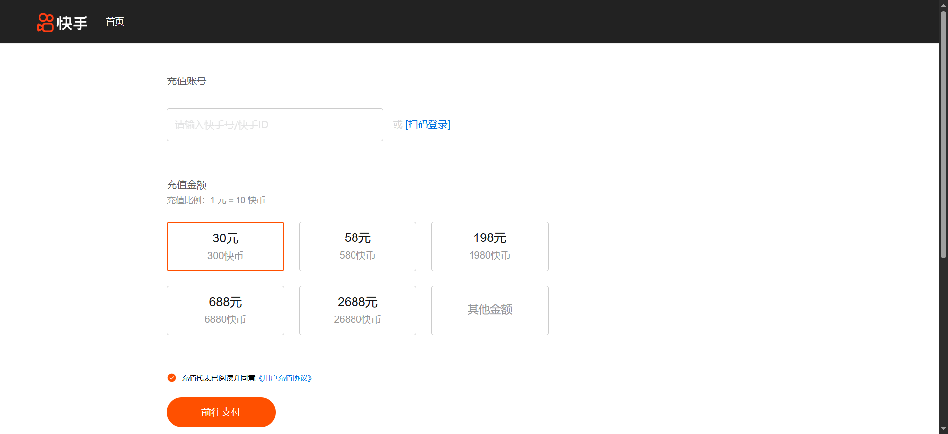 充值金额与快币的兑换比例通常为1:10(即 1 元 = 10 快币),但平台会不定期推出加赠活动。例如 2025 年首次充值 6 元可额外获得 6 快币,实际到账 66 快币。部分活动期间(如周年庆)充值 6 元档位可叠加 10% 加赠,最终到账 72.6 快币。