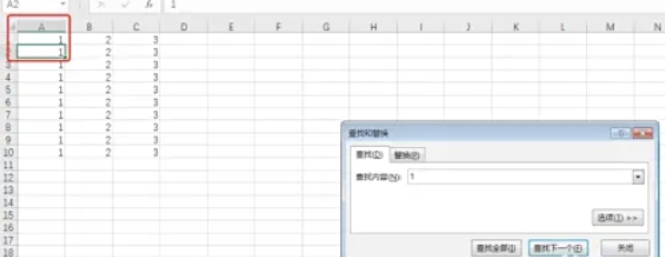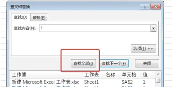 查找内容:输入 1(要查找的数字)。点击 【查找全部】(列出所有匹配项)。