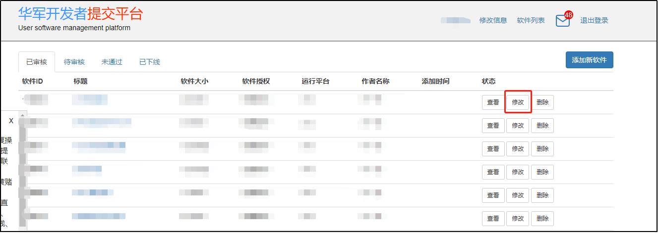 1、软件通过审核后,如需要更新版本或内容,可登陆账号后,页面右上方的【软件列表】,选择【已审核】队列,找到需要修改或更新的软件,选择右侧的【修改】,进入修改页面。
