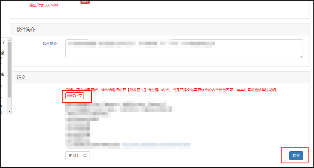 软件正文如不需要修改或更新,请选择点开【修改正文】,并清空软件正文框中内容;如需要修改或更新,只需要提交您需要修改的内容信息即可,如有其他需求请直接备注说明。
