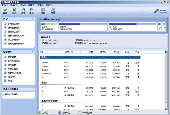 5、之后在主界面的左下方,可以看到“等待执行的操作”,这就是迁移系统所需要进行的操作,用户可以再次修改设置。如果确认无误的话,则点击上方工具栏中的“提交”按钮,之后根据提示信息,即可完成系统迁移。