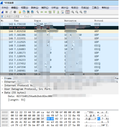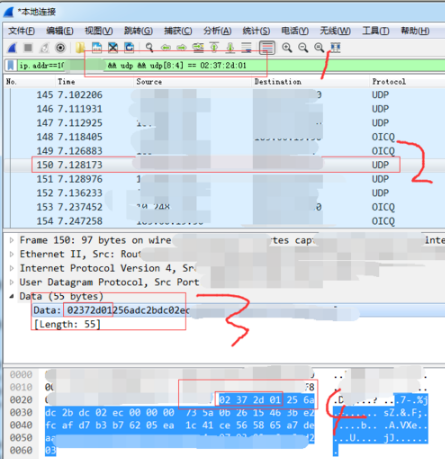 4、接下来小编将以udp包进行内容筛选,过滤地址:***** udp数据前个四字节要等于0x02:0x37:0x2d:0x01 的数据包。如:ip.addr==xx.xx.xx.xx && udp && udp[8:4] == 02:37:2d:01