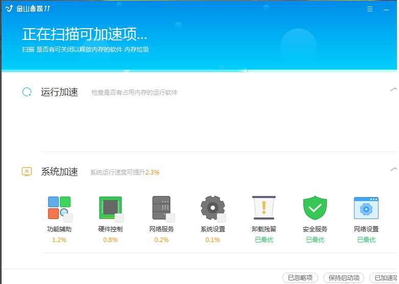 5、用户使用电脑加速功能,金山毒霸软件会扫描电脑中的可加速选项,如软件的开机自启、系统的一些辅助功能等都可以进行优化,扫描完成后用户可以选择勾选然后进行优化,使用电脑加速功能可以让电脑快速的开机运行。
