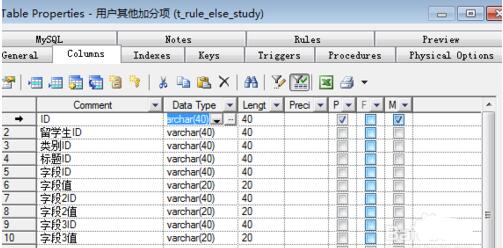 5.Date Type是设置字段的类型,其中varchar(40)是字符串型,int是数字型。在Length是字段的长度,如果是主键的话Piamary和Mandatory这两个是要选中的,一个标示是主键,另一个是标示不能为空。