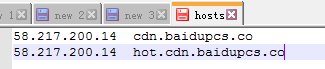 3.打开host文件后我们将58.217.200.14 cdn.baidupcs.co和58.217.200.14 hot.cdn.baidupcs.co两行信息复制粘贴到文件中保存。