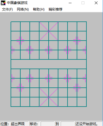 中国象棋的棋盘有九条平行的竖线和十条平行的横线相交而组成,其中共有九十个交叉点,棋子就摆在这些交叉点上。中间部分(棋盘的第五,第六两横线之间末画竖线的空白地带)称为 河界 。两端的中间(两端第四条到第六条竖线之间的正方形部位),以斜交叉线构成中文米字形方格的地方,叫作 九宫 (它恰好有九个交叉点)。