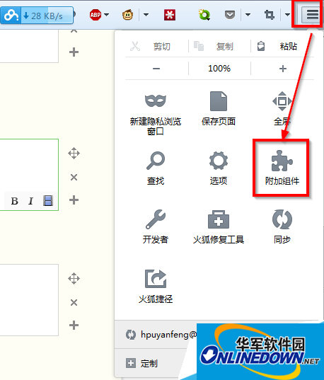点击打开菜单后你可以看到在下一级菜单可以看到附件组件选项,点击附加组件。