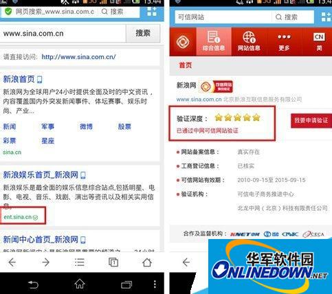 同时UC手机版浏览器同样也已实现中网“可信网站”验证。网友们只要下载并打开UC手机版浏览器,同样以“新浪”网为例,正规的网站会在搜索结果里显示“可信网站”绿色的标识,点击标识即可进入手机版的验证信息。