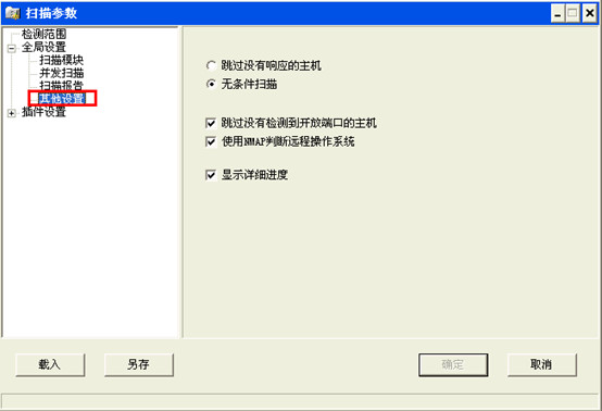 其它设置:设置对目标设备的检测机制等,如果是单个设备,建议使用无条件扫描,因为测试发现x scan判断主机是否存活不是很准确。