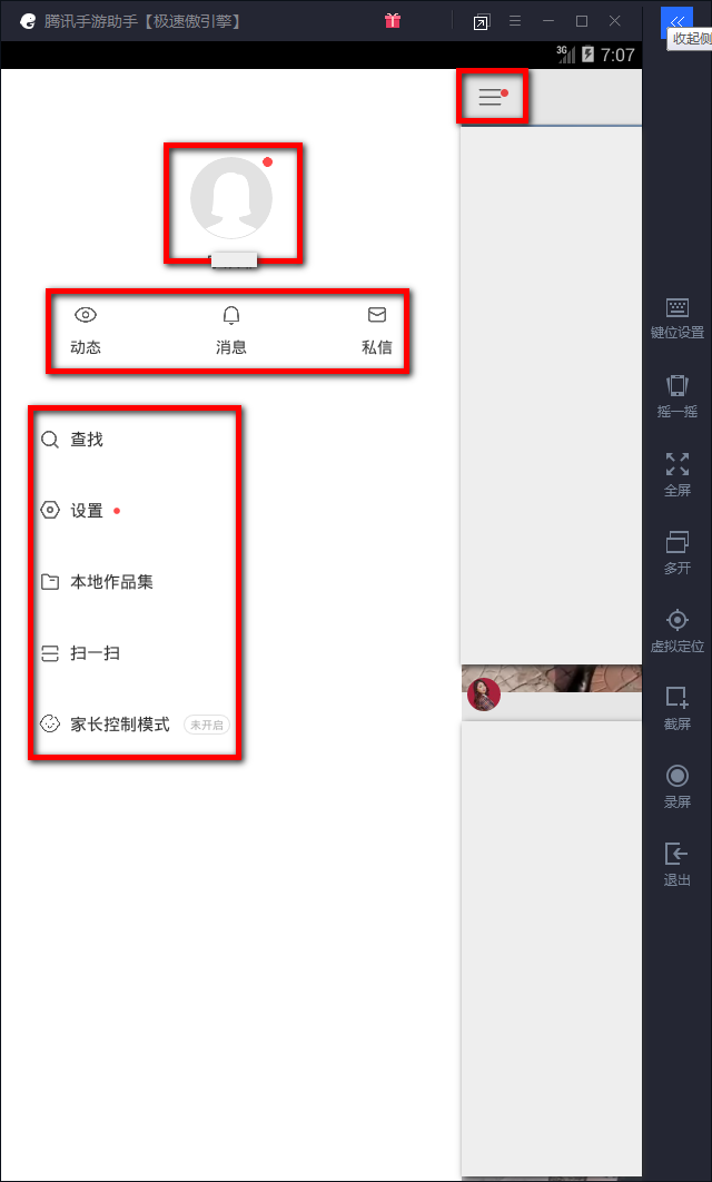 如果你想进入自己的个人信息界面请选择头像处的红框单击;如果你想看动态、消息、私信就选择头像下的红框;如果你想查找某个作品或是账号请选择底部的红框中功能按钮。