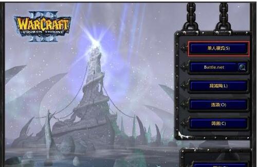 首先我们点击魔兽争霸3冰封王座的快捷方式进入到游戏,这里以人机对战为例,先点击单人模式,如图所示;